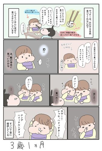 やっすー相変わらず おかず全然食べてくれません 入念に確認するやっすー 意味無いよなぁと思いながらも微量のおかずを白米に紛れ込ませて食べさせたりしています やっすーがよそ見しているうちに微量のおかずを混入させているのですが ばれる! そして吐き…