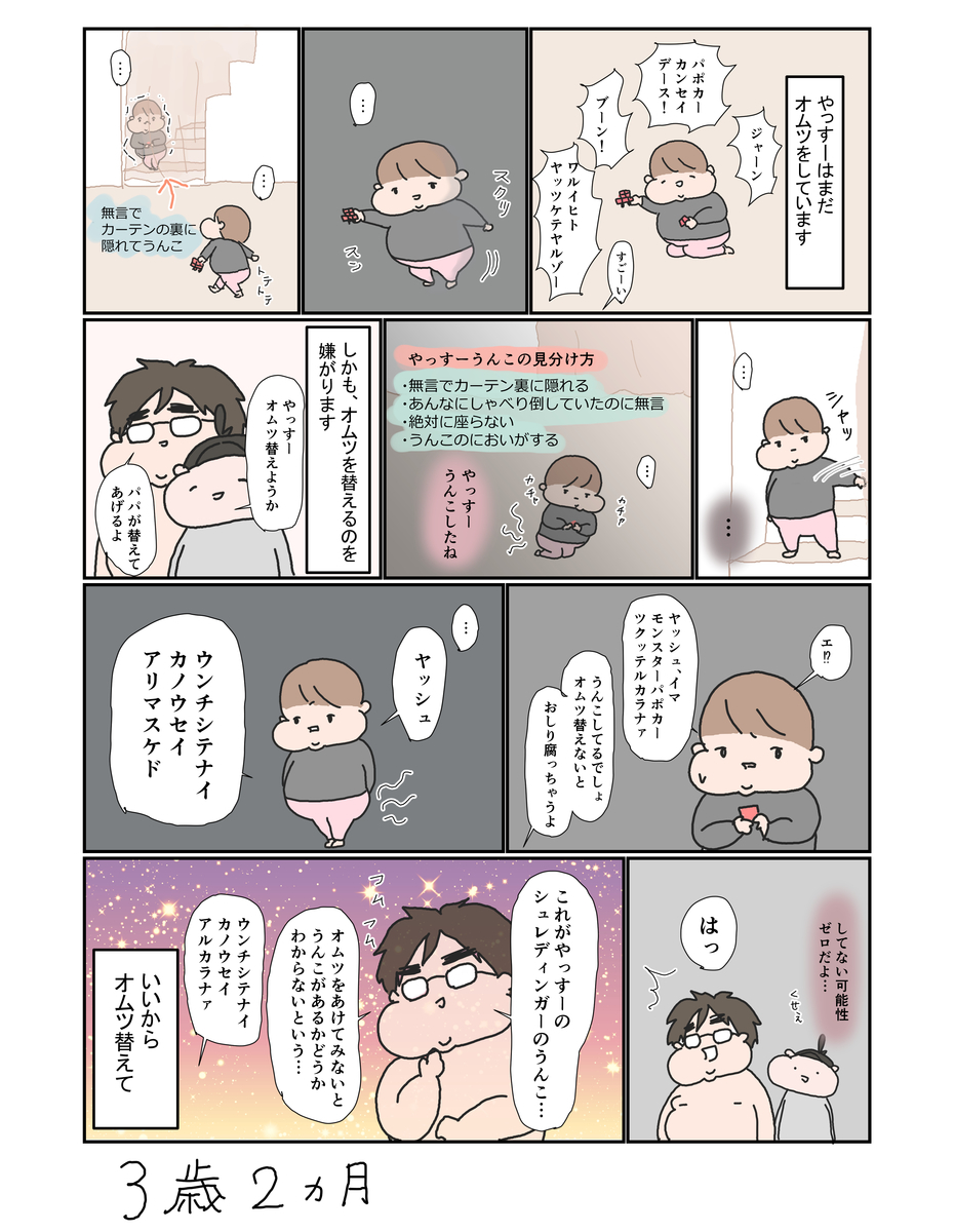 2020-03-13 トイレトレーニングやりたくない 育児日記 育児漫画 入園まであとひと月をきりましたが まだオムツをしているやっすー トイレに誘っても無反応どころかオムツを替えるのも嫌がります 可能性など無い 困った‥ と言いつつ うんうんあるある こんなこともあるので オムツってほんと便利 トイトレがんばれ自分!