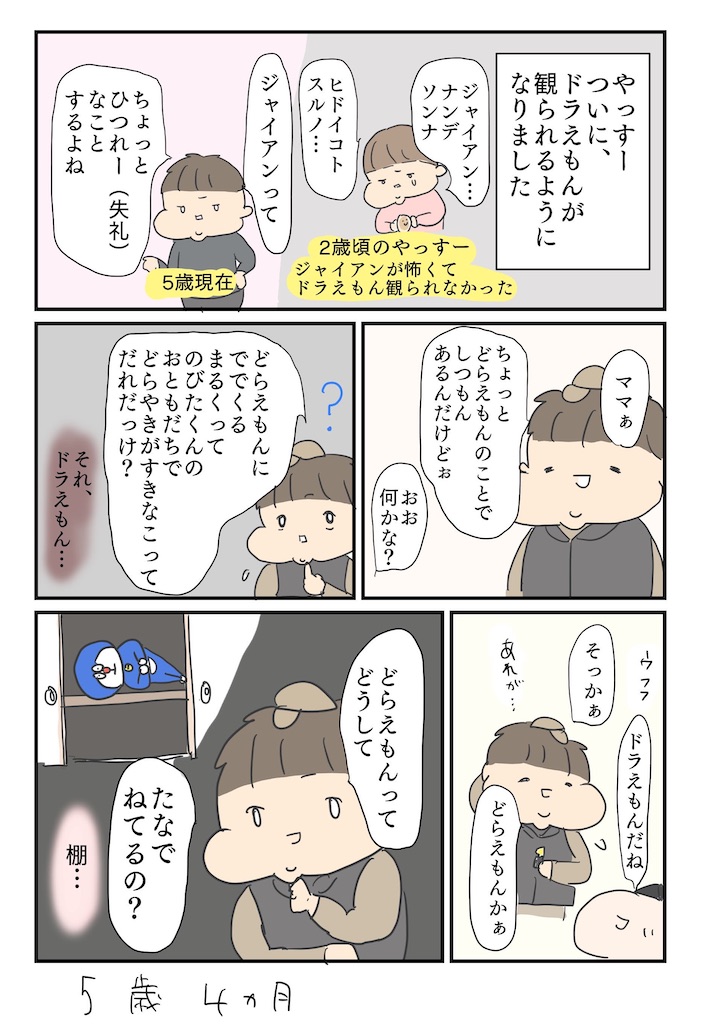 2歳とか3歳くらいのときに、ドラえもん観せたときは、ジャイアンの暴君っぷりに怯えてしまい怖がって観ることができませんでした